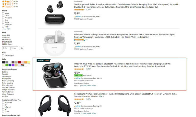 As shown in the following pictures, if you type in “wireless earbuds” only in the search buds, you’ll get more than 10,000 results in total.